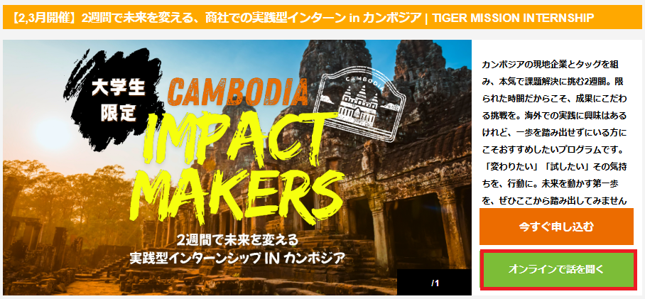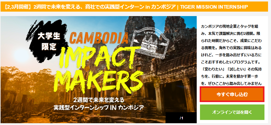 参加を決定されたら、各プログラムの「今すぐ申し込む」(このインターンに応募する)のボタン(オレンジ)からお申し込みをしてください。