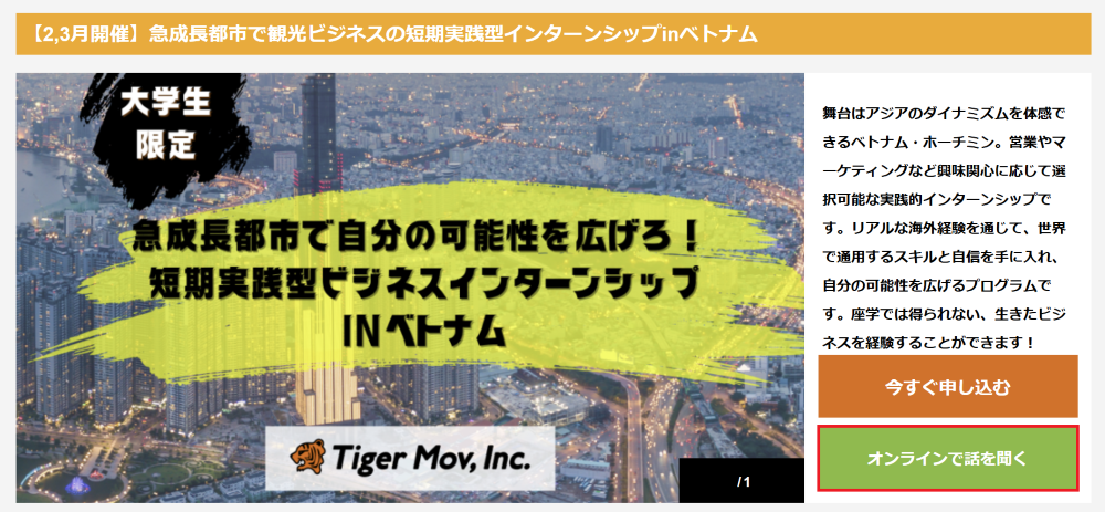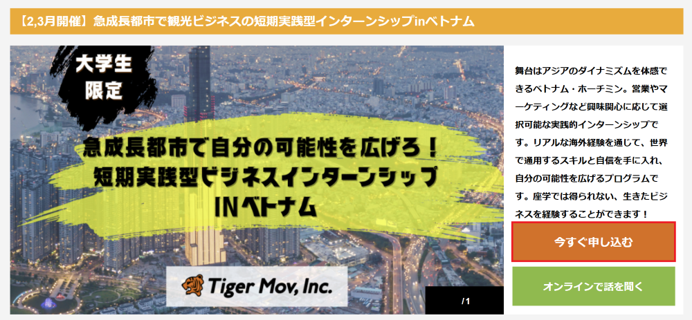 舞台はアジアのダイナミズムを体感できるベトナム・ホーチミン。営業やマーケティングなど興味関心に応じて選択可能な実践的インターンシップです。リアルな海外経験を通じて、世界で通用するスキルと自信を手に入れ、自分の可能性を広げるプログラムです。座学では得られない、生きたビジネスを経験することができます!